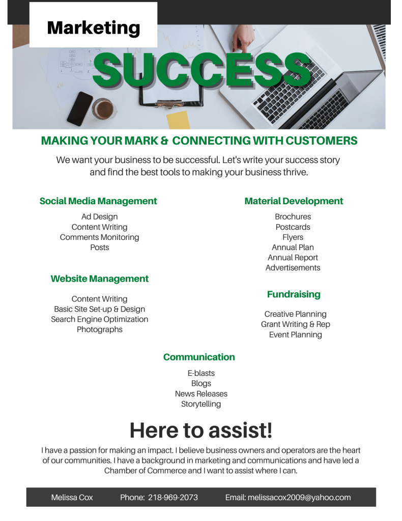 There are many ways to make your mark. Getting your name out there can help customers connect to your business. I can assist you with marketing your business and connecting with your customers. With more than two decades of experience in all industries, I have the background to provide marketing to fit your business.